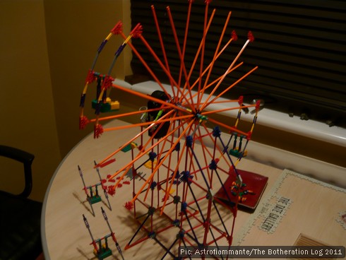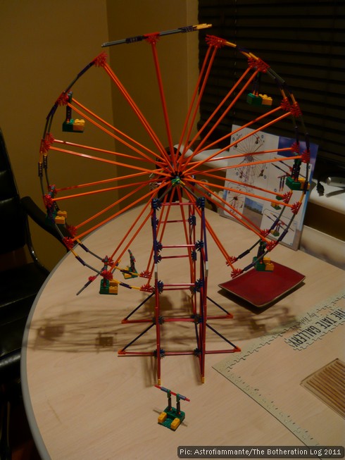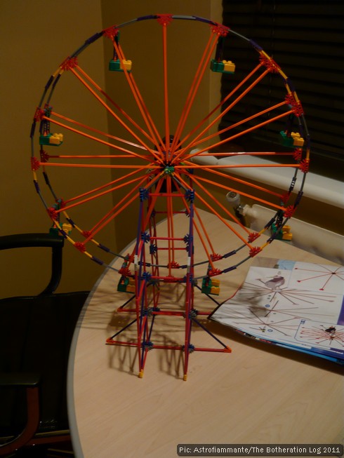 Because Significant Other is a lovely person, the 478-piece ferris wheel turned up as a Christmas gift – and was built and in use by the end of Boxing Day. It’s great. Now all we need is several of the others, and a painted papier-maché landscape to stand them all in. Give us time…